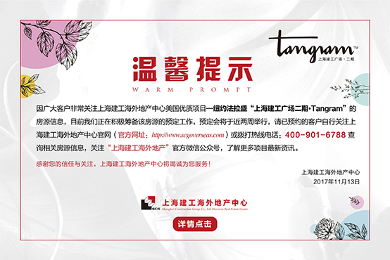因广大客户非常关注万博manbext官网app 美国优质项目——纽约法拉盛“上海建工广场二期•Tangram”的房源信息,目前我们正在积极筹备该房源的预定工作,预定会将于近两周举行,请已预约的客户自行关注万博manbext官网app 官网(官方网址://m.735257.com)了解更多项目最新资讯。