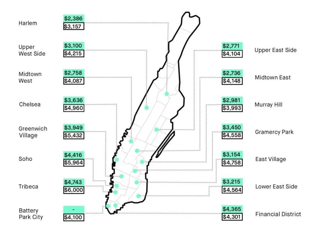 下面我们从曼哈顿的一居室公寓,来看曼哈顿各个社区的租金水平