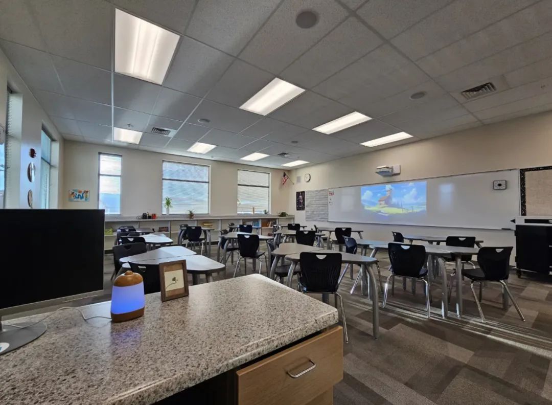 根据科目不同,教室也十分个性化,物理、化学老师的教室摆放着各种仪器,俨然一个实验室,艺术类科目的教室往往有很多图片和装饰物,看起来充满文艺气息。