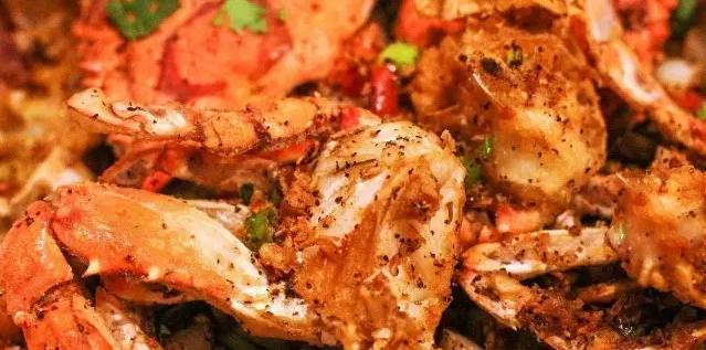 与之形成对比的则是蓝蟹——采用先炸、再入香辛料爆炒的做法。这么处理是非常讨喜的:蓝蟹壳薄,炸过以后立马变得酥脆溢香。佐以调味料猛火爆炒后,里里外外都吸足了鲜美的香辛料,而炸过以后多余的油也因翻炒被蓝蟹吸收,非但不觉油腻,还能把螃蟹特有的鲜味紧紧锁住。蟹肉入口,一股纯粹的幸福感油然而生。