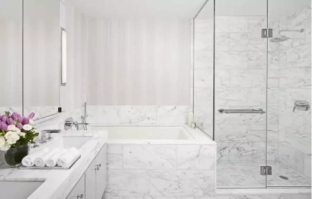 Jamie Drake独家定制浴室专属配件!盥洗室大气开阔,意大利Carrera白色抛光大理石极大地打开了空间的丰盈感,梳妆台精心配置Calacatta防溅挡板。简约中成就最精致的梳洗体验。