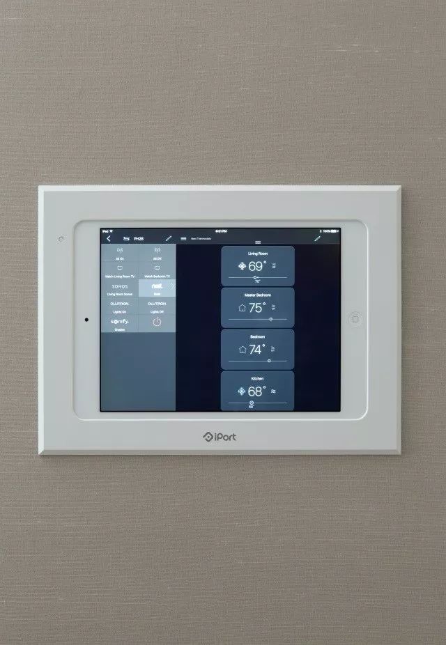 Nest品牌温度调节器,可通过手机监控和调节家中的温度。无论是酷暑还是寒冬,无论您身在何处,打开家门时迎接您的都是春暖秋爽。纽约的冬天寒冷异常,这时候如果回到家再开暖气,待暖和起来时已受了很久的冻了。有了Nest智能温度调节器,您在回家的路上就可以通过手机提前打开暖气预热起来。这种温馨感与科技感并存的体验正是智能家居所提倡的。此外,Nest温度调节器还具有自我学习的功能,会根据您的日常能耗自行调整,只需一周的使用就会着手打造最适宜您的温度方案。