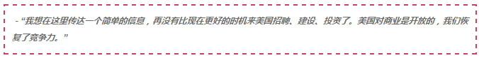 特朗普在论坛上称,美国正在推进历史上规模巨大的税制改革,为中产、小微企业减轻了负担,美国的劳动者也从企业减税中获利。他表示,美国的税收改革将税率从35%调降至21%,目前来美国做生意是最好的时机。尤其是,税改促使苹果公司计划把2450亿美元海外资金带回美国,并宣布未来五年在美投资3500亿美元。