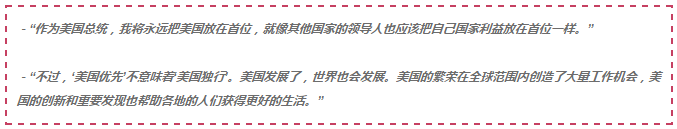 在发言中,特朗普再次强调了“美国优先”的理念,并借机抨击了“不公平贸易”,称不会再容忍不公平的贸易行为,希望“改革国际贸易体系,使它能给遵守规则的参与者带来利益”。