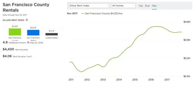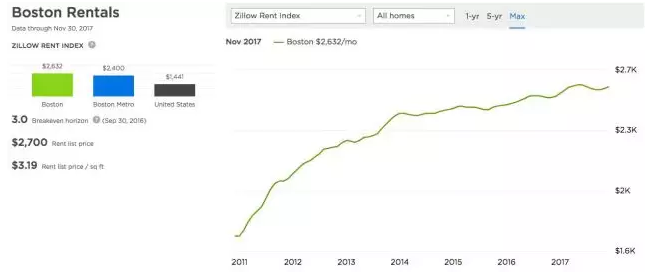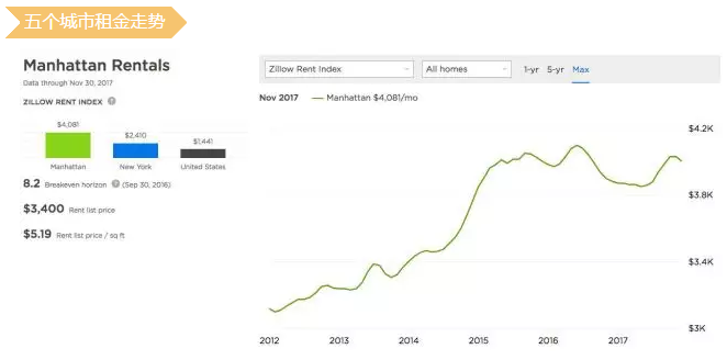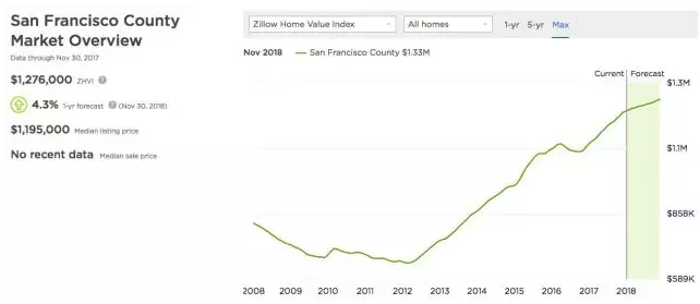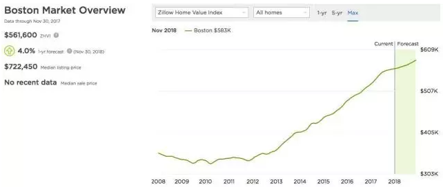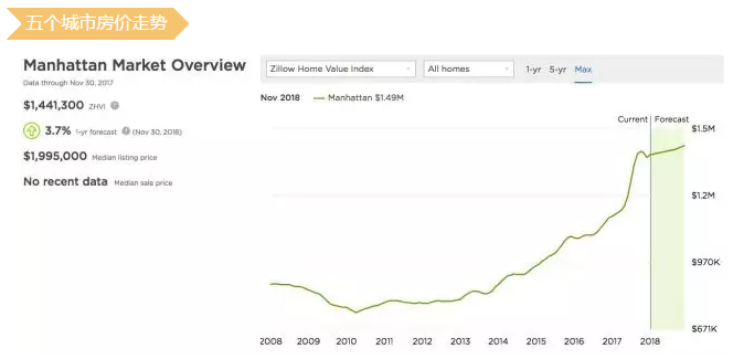 美国的房价从2008年金融危机开始下跌,在2012年触底反弹,并且在过去5年中涨势强劲,根据Zillow的预测,2018年波士顿、旧金山、洛杉矶、西雅图和纽约5个城市都依然有上涨空间。 在此城市中,中位价相对较高的是纽约(149万美金)和旧金山(133万美金),主要跟两地强劲的经济支柱和旺盛的房产需求有关。