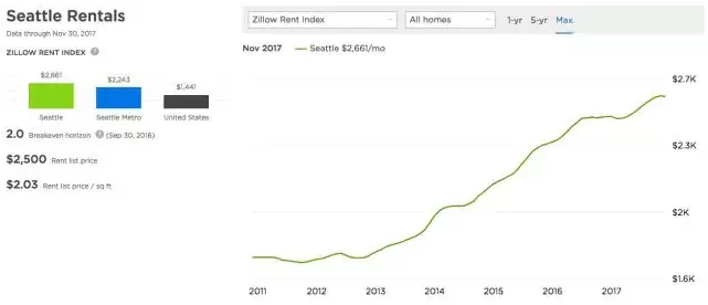 与房价相比,5个城市的租金则呈现不一样的走势。根据上图过去5年的租赁数据,房价水平最高的纽约和旧金山同样具有最高的租金,月租金可达4000美金以上,这2个城市的租金在2015和 2016年达到最高值,随后开始一定程度的回落。波士顿近几年涨势放缓,洛杉矶和西雅图则连续5年均呈现明显的上升。