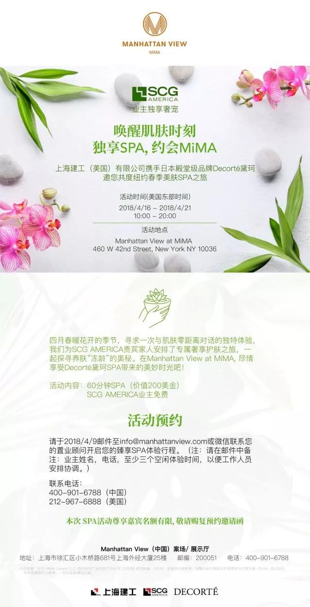请您在2018年4月9日前发送邮件至邮箱进行预约,邮箱地址:info@manhattanview.com。或者您也可以通过微信联系您的置业顾问来开启您的臻享SPA体验行程!(注:请您在邮件中备注:业主姓名、电话以及至少三个空闲体验时间,以便工作人员安排协调。)
